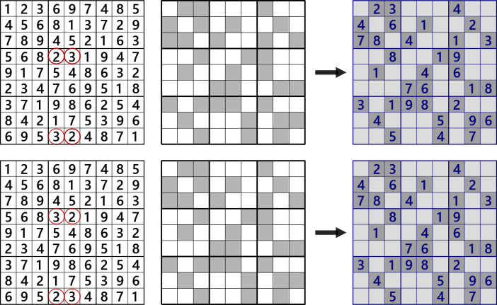 newline>Applying a mask (middle) to a Latin square (left) results in a Sudoku puzzle (right).
