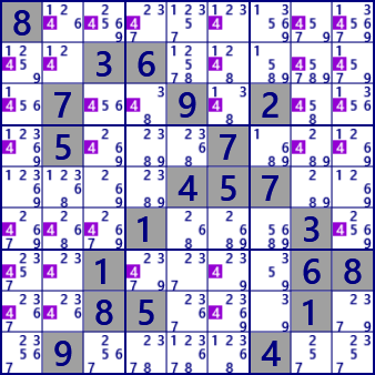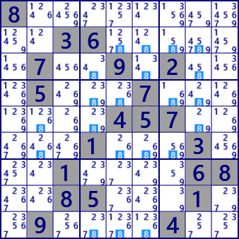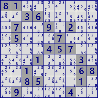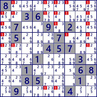 例えば、r1c1#8を空白にした問題(下図)では、これを満たす数字パターンの配列は292あります。