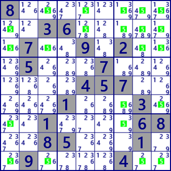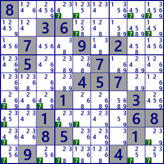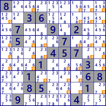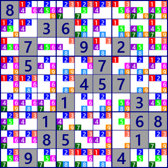 さらに、1つの数字のみを色付け表示しました。数字7がやや少ない感がしますが、どの数字も盤面全体に 広く分布して、特徴は見えません。また、どの数字でも、多くの行・列・ブロックに3以上の箇所に配置されています。 1つの行・列・ブロックに候補が2つの Strong Link は、 13リンク(r9#1,b8#1, c5#5,b2#5,r6#5,b6#5,r7#5, r6#7,b4#7,c3#7 ,c2#8,b4#8, b1#9) のみです。 Strong Link が少ないことは、問題の難しさの一要因かもしれません。