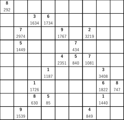 候補数字の数 2 3 4 5 6 7 8 9 セル数 1 11 25 20 2 1 0 0 - 候補数字の分布
