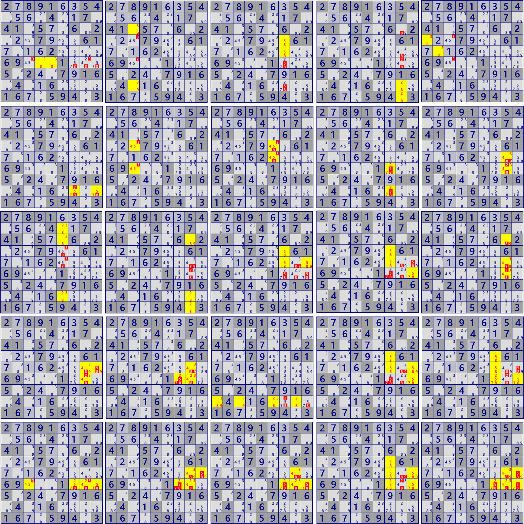 このページの最初の問題(左上から2789…の図)にはLockedSetが25個あります。互いに相補関係にあるLockedSetも見つかります。