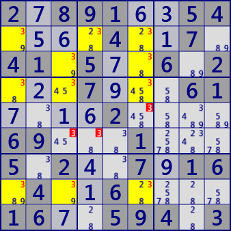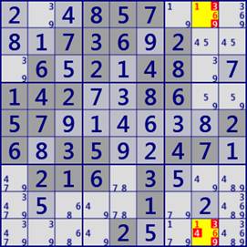 これは数独のルールから明らかでしょう。次に選択セル群は「セル数=次数 < 候補数字数」です。