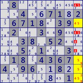 次の左図は 3-LockedSet(Hidden)の例です。ブロックb4のr4c23とr5c2は、候補数字249に関して3セル3数字の3-LockedSetが成立します。 右図は 4-LockedSet (Naked)の例です。9列のr3789c9に着目すると、数字3459について4セル4数字の4-LockedSetが成立します。また、右図の9列のr1456c9については4セル4数字の4-LockedSet(Hidden)が成立しています。黄色のセル群と対となるLockedSetです。