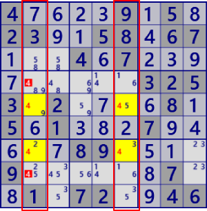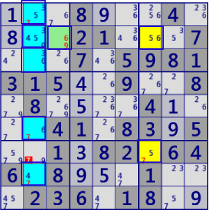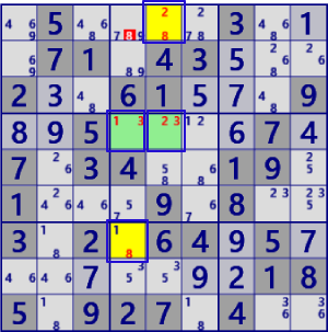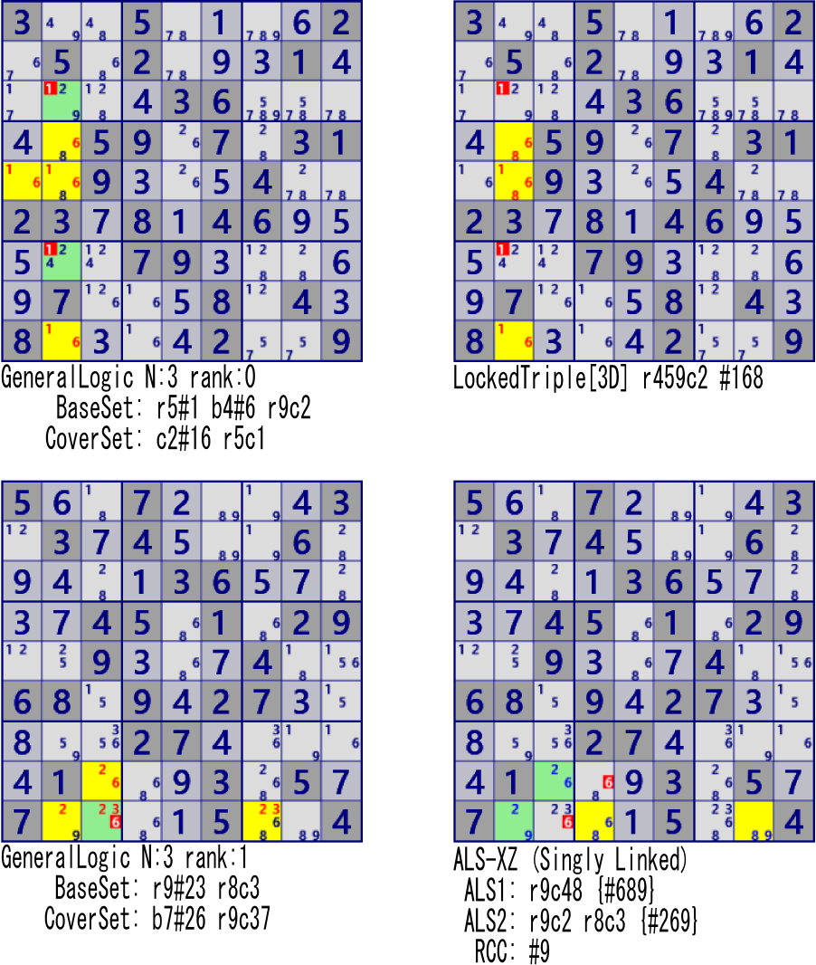 GeneralLogic解の例を示します。上段は 「LockedTriple[3D] r459c2 #168 r37c2#1 is not True」と除外されるセル・数字は同じですが、従来手法に対応する解法がありません。